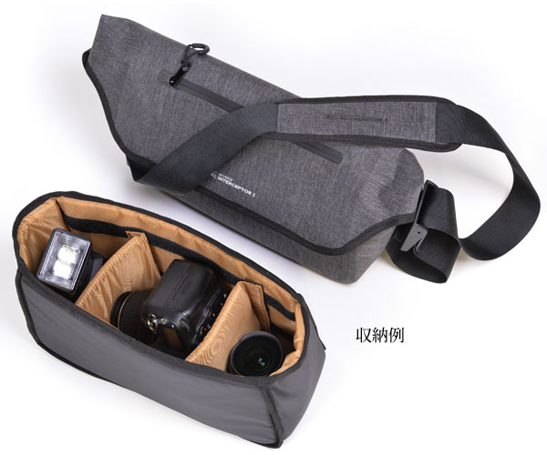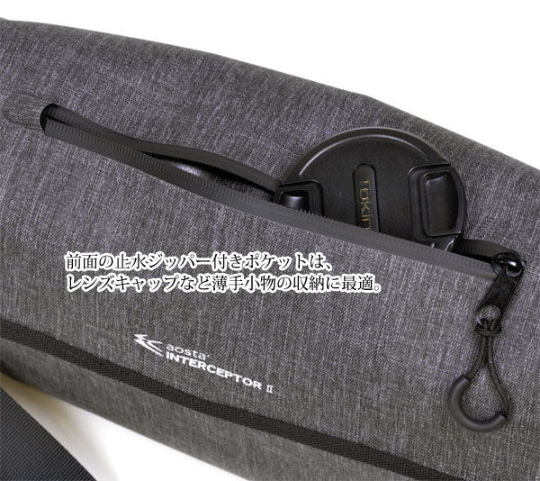 ●アオスタ インターセプターIIは、生活防水仕様のカメラバッグです。防水性に優れたTPU素材を採用し、メインルームやジッパーポケットには水滴が入りにくいよう配慮しています。