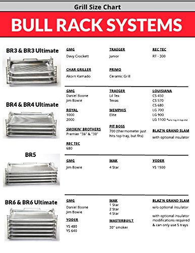 - Bull Rack measurements: 19-1/4 inch W x 13-1/2 inch D x 10-7/8 inch H; tallest point at handle; BR6 = 1,140 sq inches on cooking trays; U.S. Patent No. D769,679