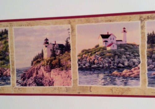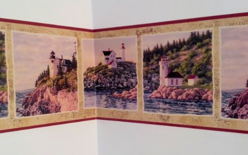-. Feature : Lighthouses on Cliffs Wallpaper Border - 3 Scenes framed in series / Prepasted Wallpaper Border - 15 Foot Long Spools / 9.5 Inches Wide - Washable, Strippable / Red Edging - American Greetings Branded