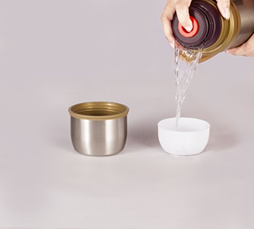 SINGLE HAND POURING » Pour spout opens easily with push button cup plug, making one-handed pouring simple. The outer cap can be used as bowl and small cup when eating or drinking.