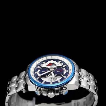 -. Feature : ムーブメント:クォーツ、表示 :アナログ 機能:クロノグラフ、タコメーター、ストップウォッチ、防水:3m / ケースサイズ(約):直径49㎜X幅49㎜X厚さ14㎜  素材:ステンレススティール / バンドカラー:シルバー バンド素材:ステンレススティール 留め金:ディプロイメントクラスブ / 文字盤:ブルー/ホワイト 風防:ミネラルクリスタル / 付属品:オリジナルBOX 当店1年保証 取扱説明書なし