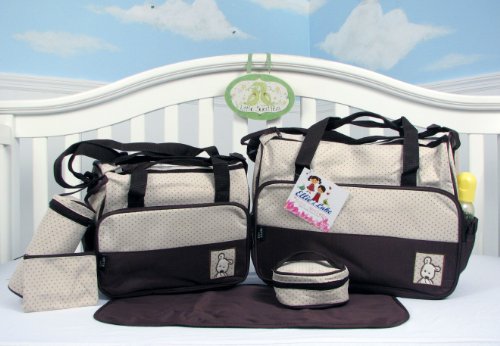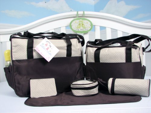 The Mommy Essentials 5-piece Diaper Tote Set is an unmatched value, and the complete solution for taking baby on the go. The large tote bag, a smaller tote bag and comes with a matching changing station, wipes case, insulated bottle bag, an accessory case. This set is everything a busy mom needs. All accessories include over the shoulder straps so they can be attached anywhere - on the bag or on the stroller. Soho - Mommy Essentials 6-Piece Diaper Tote Set: * Extra roomy main compartment with multipe pockets * Reliable zip-top closure * Durable double tote straps * Includes 5 coordinating accessories: * Padded changing station * zippered wipes case * Insulated zippered bottle bag, fits most size bottle (bottle not included) * Food diaper bag with zip closure and carrying strap * Accessory case with zipper closureFeature