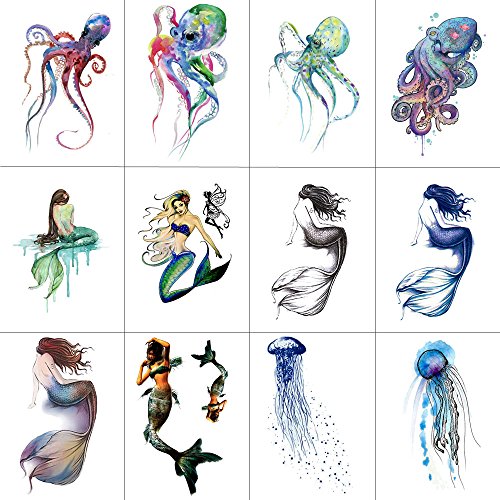 WYUEN 12 PCS Octopus Mermaid Temporary Tattoo Sticker for Women Men Fashion Body Art Adults Waterproof Hand Fake Tatoo 9.8X6cm W12-09