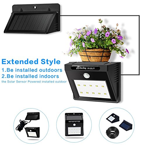 - SEPARABLE PANEL- Hiluckey solar lights Optional Installation OUTDOOR / INDOOR ,Compared to other similar solar motion sensor lights, Hiluckey solar panel and light body can be separated, and package attached a 8 feet explosion-proof extension cord, to solve the problem of solar light shine restricted.