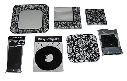 -. Feature : Black and White Damask P.R.Int Party Pack Includes: / (8) 9.125 inch paper plates with damask border P.R.Int / (10) 6.875 inch black and white damask paper plates / (20) 12.875 inch 2 ply paper napkins and (2) 9.75 inch 2 ply paper napkins / (12) black latex 12 inch round balloons, (2) 16 inch round black tissue balls, (10) black 15.5 inch hanging dizzy danglers