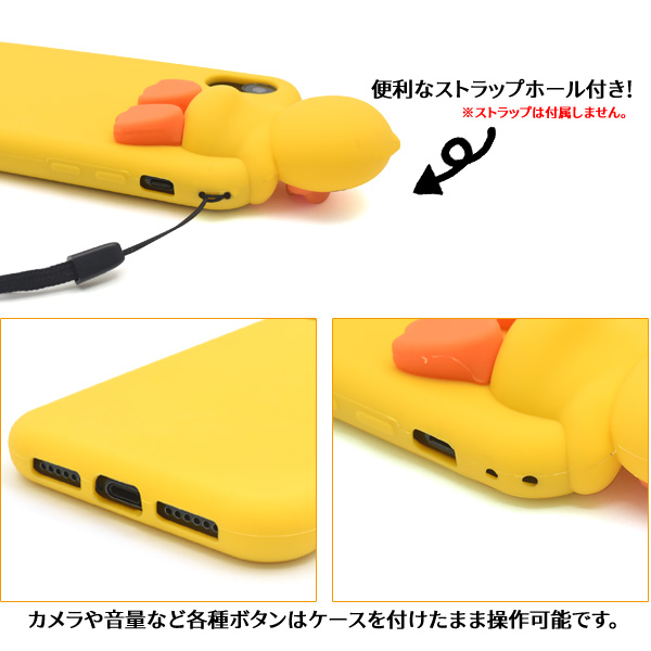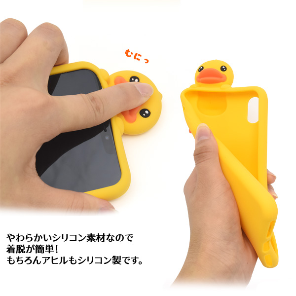 カメラの横にちょこんとぶら下がっています。 背面から見てもおしりが可愛いアイテムです。 やわらかいシリコン素材なので着脱が簡単。 衝撃にも強く、キズ、埃などからしっかりとiPhone XRを守ります。 もちろんアヒルもシリコン製です。