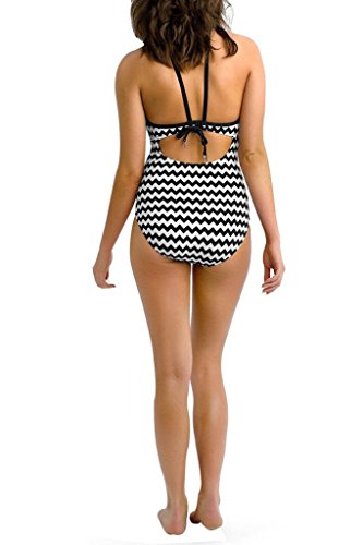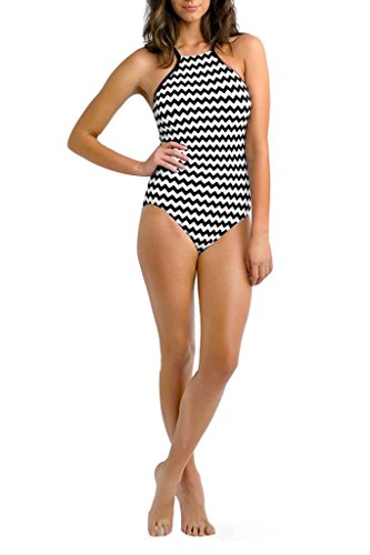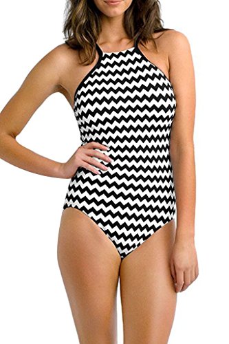 FARYSAYS Women's Monochrome Waved Retro High Neck One Piece Top Bikini Medium Size