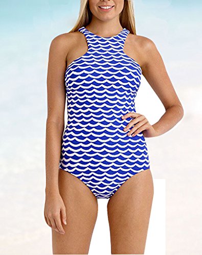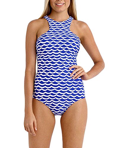 FARYSAYS Women's Blue White Tidal Wave High Neck One Piece Maillot Swimsuit XXL