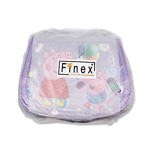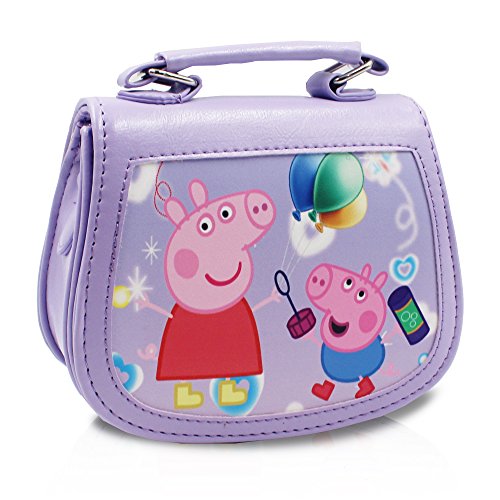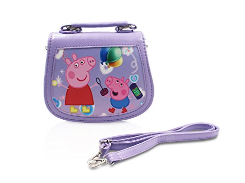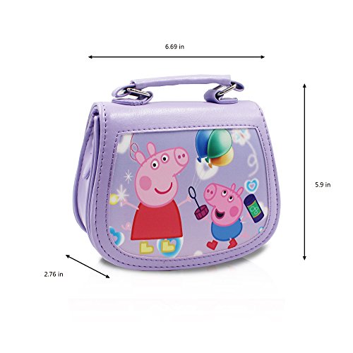 One Purple Peppa Pig Premium PU Leather little handbag - cross-body + hand-carry. Snap closure. A compartment with a zippered pocket inside. Removable and adjustable shoulder strap. The top handle makes it a cute hand carry purse without the strap. Dimension: (H) 5.9 in x (L) 6.69 in x (W) 2.76 in. Finex is a registered Trademark. Sold exclusively by Finex Authorized Distributor.Feature