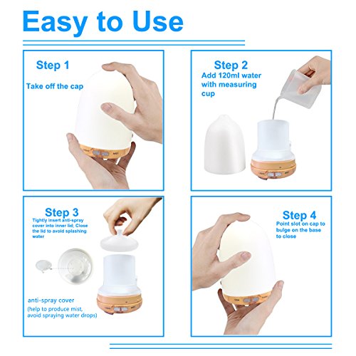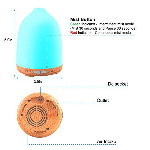 - 🎁UNIQUE DESIGN-This aroma diffuser is coated with wood grain botton, which makes it look very natural and special. With compact and portable design, the cap of the aroma diffuser is easy to take off, you won’t bother to unscrew the cap with great force when your hands is wet. Just gently take off the cap, add water and essential oil, enjoy high-quality life.
