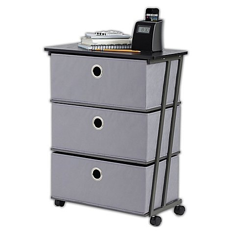 -. Binding : Kitchen -. Brand : Studio 10 -. Color : Grey -. EAN : 0744745173468 -. Feature : The Studio 3B Storage Cart is on wheels for easy transporting / 2 wheels are lockable to keep the cart stationary / Top shelf can be used as a table top or a display shelf / Features soft-side bins for storage / Accented with chrome grommet handles / Steel/MDF/textile fabric / Wipe clean / Black / Easy to assemble / Durable fabric drawers; hard top surface / Wipe clean / Imported / Measures 23.38" W x 12" D x 29.75" H / Each drawer measures 20" W x 11" D x 8.375" H -. IsAutographed : 0 -. ProductGroup : Home -. ProductTypeName : HOME -. Title : Studio 3BTM 3-Drawer Wide Storage Cart in Grey -. UPC : 744745173468