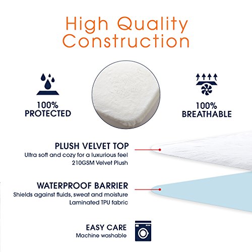 -. Feature : 100% WATERPROOF PROTECTION - Preserve your mattress and keep it fresh and clean from stains, dirt, and fluids. Fully repels leaks and spills / QUIET & BREATHABLE FABRIC - The same complete protection as standard mattress protectors without the plastic, crinkly sounds. Machine washable / ULTRA LUXURIOUS & SOFT - The velvety soft fabric provides the ultimate comfortable sleep while protecting from bedwetting, incontinence and pets / HYPOALLERGENIC BARRIER - Treated to keep you safe and protect you and your mattress from exposure to dust mites, bacteria, and other allergens / DEEP POCKET SKIRT- Elastic stretch fabric easily fits and stays snug on deep mattresses. Twin, Twin XL, and Full stretch up to 14"| Queen and King up to 18"