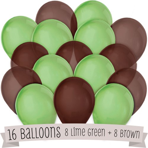 • 16 Pack of 11" latex Balloons - (8 Green & 8 Brown). Balloons will arrive flat.