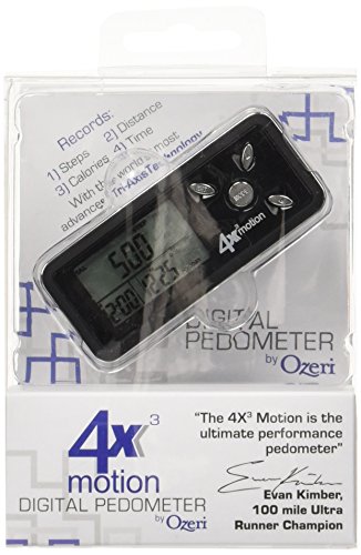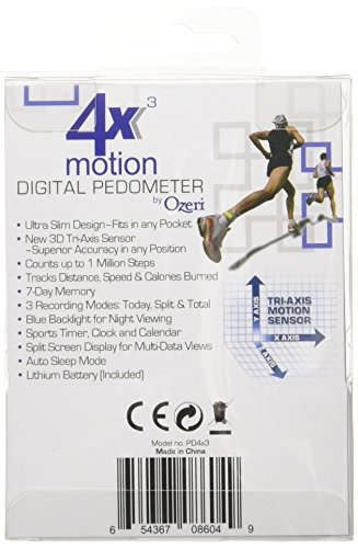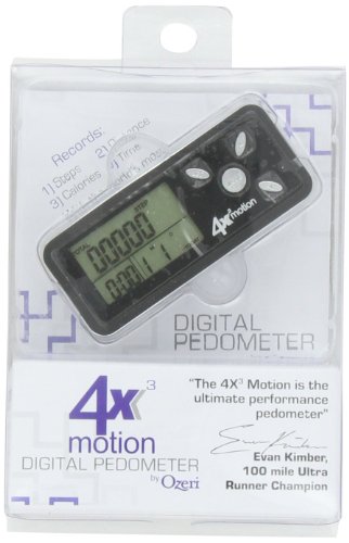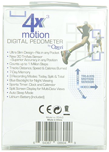 Studio : Ozeri Publisher : Ozeri Binding : Misc. Product Description Introducing the 4x3motion Digital Pedometer by Ozeri - the world's most advanced 3D pedometer. Unlike other pedometers that do not work accurately unless placed vertically, the 4x3motion Digital Pedometer utilizes the latest generation in Tri-Axis technology to provide superior accuracy in any position, whether up, down, flat, on its side, or at any angle. Moreover, the 4x3motion Digital Pedometer utilizes a Digital 3D Acceleration Sensor which is far more accurate than mechanical sensors used in other pedometers. Compact, sleek and ultra slim, the 4x3motion Digital Pedometer fits is any pocket and is the ultimate personal trainer. Used by professional 100 mile ultra runners such as Evan Kimber, the 4x3motion Digital Pedometer records your steps, distance, average speed, calories burned, and time spent exercising, and displays your data on a new bright LCD with a night view backlight. The 4x3motion Digital Pedometer filters out vibrations and only begins counting after it detects a sequence of continuous steps for greater accuracy. The 4x3motion Digital Pedometer ships with a Lithium battery, a bonus strap and instruction manual. Your satisfaction is 100% guaranteed. 0