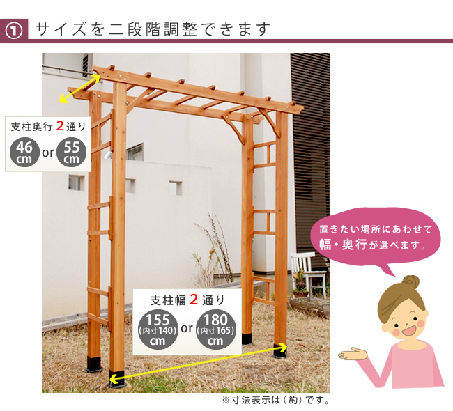●幅と奥行を二段階調整できるだけでなく、 同じアーチを連結させて、藤棚や葡萄棚のようなトンネル状のパーゴラを設置することもできます