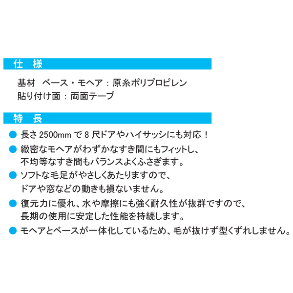 ●長さ:2500mmで8尺ドアにも対応します。緻密なモヘアがわずかなすき間にもフィットし、不均等なすき間もバランスよく塞ぎます。