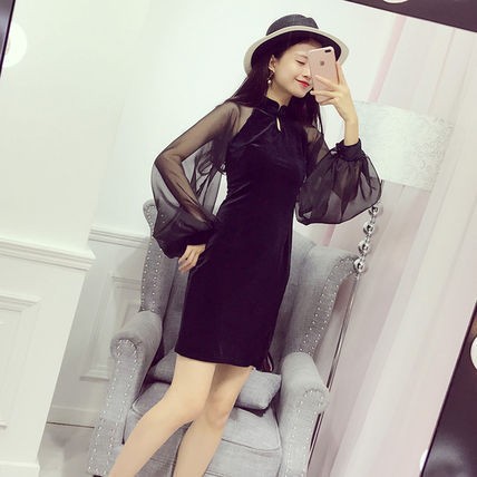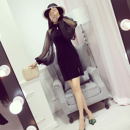 パーティードレス ミニ丈 ワンピース タイト ボリューム袖 透け感 シースルー ベロア ブラック スリット セクシー 大人 お呼ばれ drgz2551