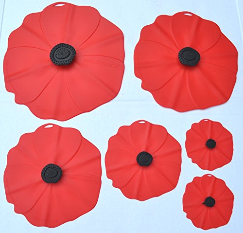 -. Feature : Set of 6 Red Poppy Silicone lids-11", 9", 8", 6", 4", 4". Perfect gift for that bride, mom, friend, or housewarming. Use it for the summer potlucks, fall potlucks and perfect for Christmas or Holidays. If you love red, this is the perfect set for you! / Made of FDA approved food safe silicone. • Seals tight on all smooth rims: stainless steel, glass, plastic, melamine / Prevents Spills, the Poppy Lid creates an airtight, watertight seal for reheating and storing. / Saves on Plastic Wrap, as the Poppy Lid can be reused over and over again. / Safe for oven, microwave, freezer and dishwasher. Included with each set is a red and white Hibiscus Tote bag