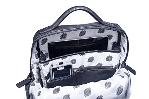 -. Feature : Deluxe top grain leather contoured backpack / Pockets for tablet, electronics / Deluxe pale silver Harley-Davidson signature lining