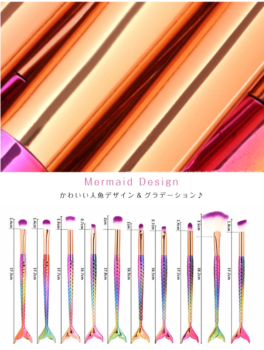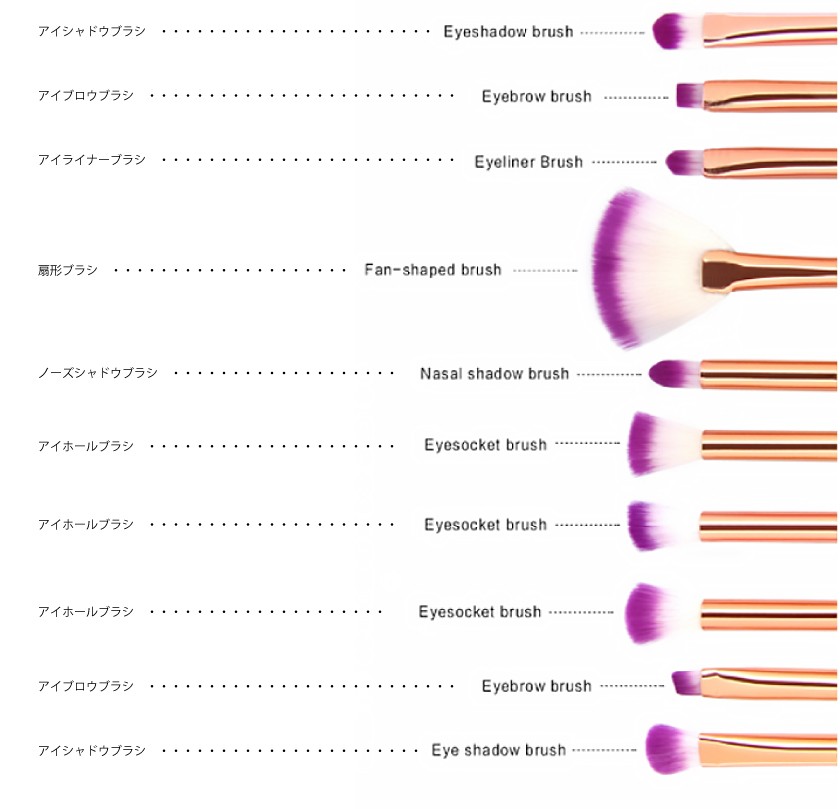 | セット内容 | 10本セット(アイホールブラシ3本、アイシャドウブラシ2本、アイブロウブラシ2本、扇形ブラシ1本、ノーズシャドウブラシ1本) |