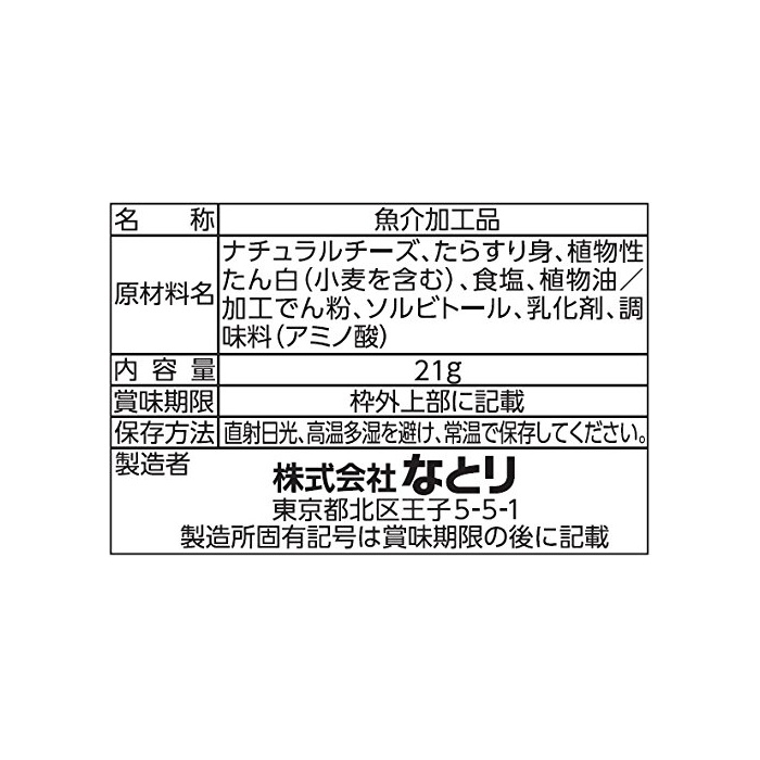 원재료:내츄럴 치즈,대구 으깬 어육,식물성 단백,식염,식물성 기름,가공 나오지 않겠 분,솔《비토루》,유화 제,조미료(아미노산)고,(원재료의 일부에 밀을 포함한다)