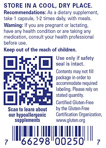 FREE FROM: At Pure Encapsulations, our product are free from wheat and gluten; egg; peanuts; coatings and shellacs; GMOs; magnesium stearate; trans fats and hydrogenated oils; artificial colors, flavors and sweeteners; unnecessary binders, fillers and preservatives. Any product containing ingredients derived from allergens, such as soy, dairy or shellfish, is clearly labeled. All two-piece capsules are hypoallergenic and vegetarian.
