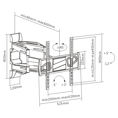 -12°~ + 5° Tilting, + 70°~ - 70° swivel,+ 3°~ -3° level adjustment,