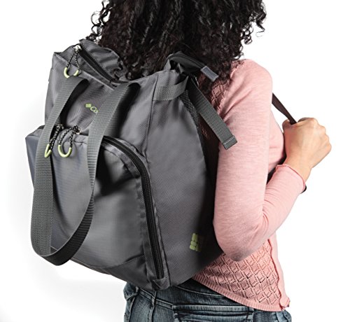 Converts from a tote bag to a backpack with a padded back panel for your comfort