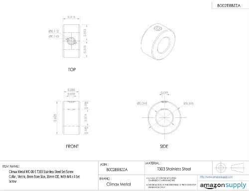 Climax Metal MC-08-S T303 Stainless Steel Set Screw Collar, Metric, 8mm Bore Size, 16mm OD, With M4 x 4 Set Screw