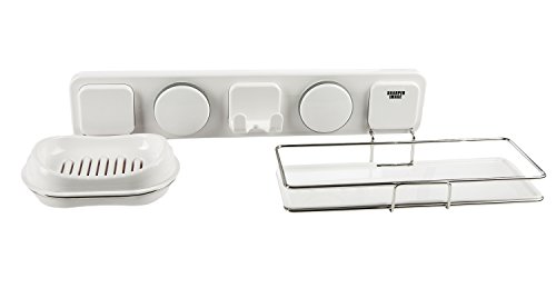 SHARPER IMAGE MULTI-POSITIONAL SHOWER CADDY - FITS ALL WALL SPACES - CUSTOMIZABLE - INCLUDES SHELF, SOAP TRAY, AND HOOK - 15 INCHES X 10.5 INCHES WHEN VERTICAL