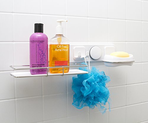 INCLUDES SHELF, SOAP TRAY, AND HOOK: Comes with a shelf for holding things like shampoo, body wash, and conditioner, a soap tray for holding hand soap, and a hook for hanging razors and luffas.