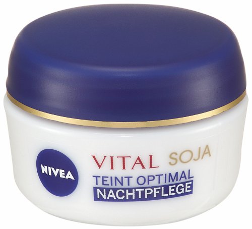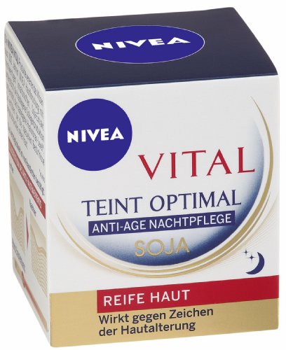 -. Binding : Health and Beauty -. Brand : Nivea -. Department : Face & Oral Care -. EAN : 4005808866571 -. Feature : Specifically developed for for the special needs of mature skin / With rich Soy proteins / Tightens the the skin and reduces the appearance of fine lines and wrinkles / Contains calming Panthenol and soothing Licorine / Made in Germany -. IsAdultProduct : 0 -. Label : Nivea -. Manufacturer : Nivea -. Model : 86657 -. MPN : 86657 -. PackageQuantity : 1 -. PartNumber : 86657 -. ProductGroup : Beauty -. ProductTypeName : BEAUTY -. Publisher : Nivea -. Size : 50ml cream -. Studio : Nivea -. Title : Nivea Visage Vital Teint Complexion Optimal Anti-Age Soy Night Care Cream 1.69 fl. oz - 50ml