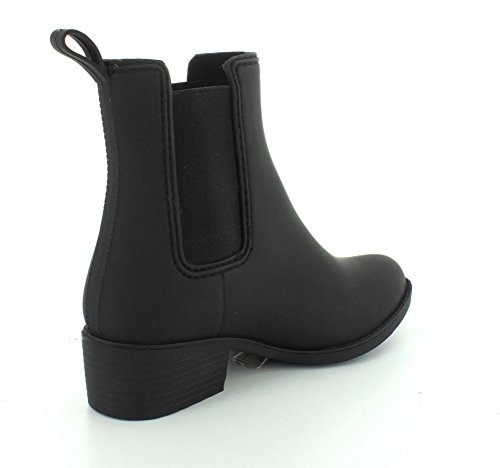 Product DescriptionSleek Jeffrey Campbell rain booties in matte rubber. Inset elastic gores create a close fit, and the toe tapers to a neat almond point. Stacked heel and rubber sole.0
