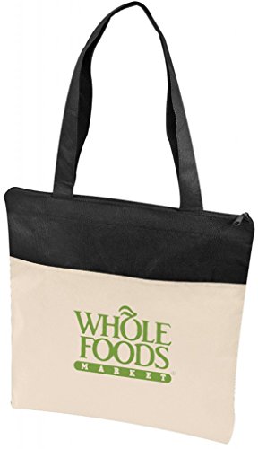 -. Feature : Non Woven Tote with Zipper / Material - 80gm Non-woven polypropylene / Size - 15 W x 16 H x 1-1/4 D in. / Color - Natural/Black / Case of 120