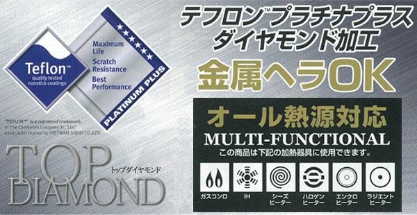 テフロンプラチナプラスダイヤモンド加工で金属ヘラも使用できます。オール熱源対応。 |