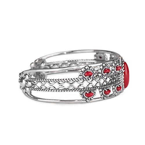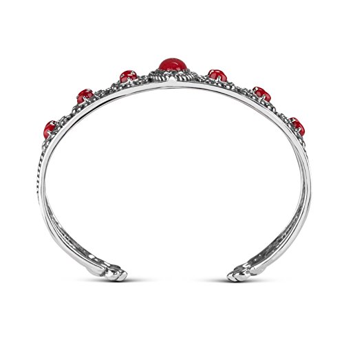 Openwork sterling silver detail and punched of color make this cuff a necessity for your jewelry box! Sterling silver in cross stitch and beaded detailing create the unique look of this cuff bracelet. Bright red coral cabochons create pops of color throughout the cuff for a fun and festive look.