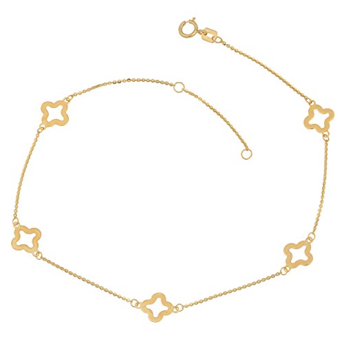 This gold flower anklet is crafted of high polish finished 14k yellow gold and features a majestic glow. This 14k gold anklet features a station of flower clover design on cable chain. A perfect accessory with dresses, skirt, short pants, and the likes, this 14k gold anklet is the perfect summer accessory.
