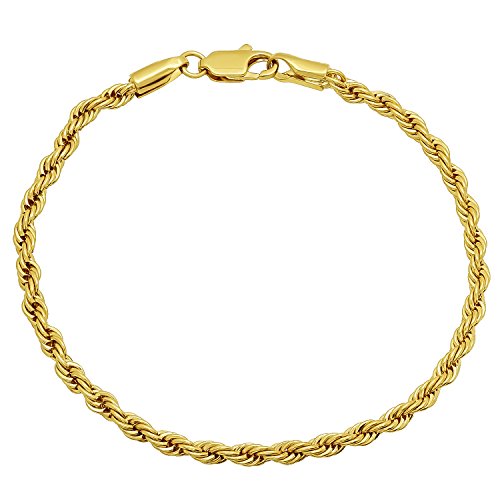 Sleek and chic, this 3.5mm gold plated rope chain features rich layers of 14k yellow gold over solid brass. Its delightful stepped and twisted braided rope chain necklace design sparkles in the light. Its size makes it ideal for layering or pairing with a pendant or Cross. Available in shorter and longer chain lengths. Full Lifetime Replacement Guarantee. Lobster Claw Clasp.