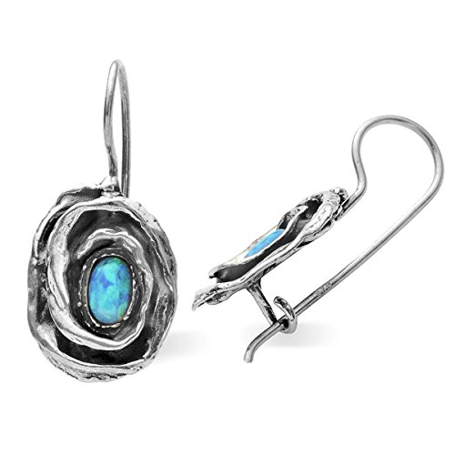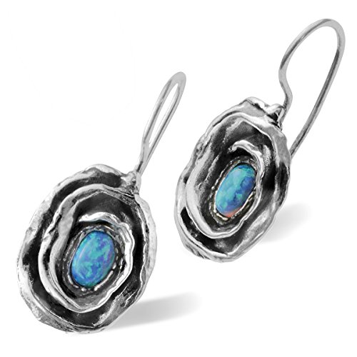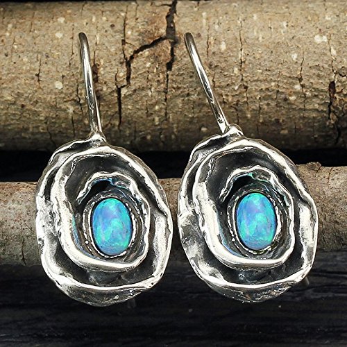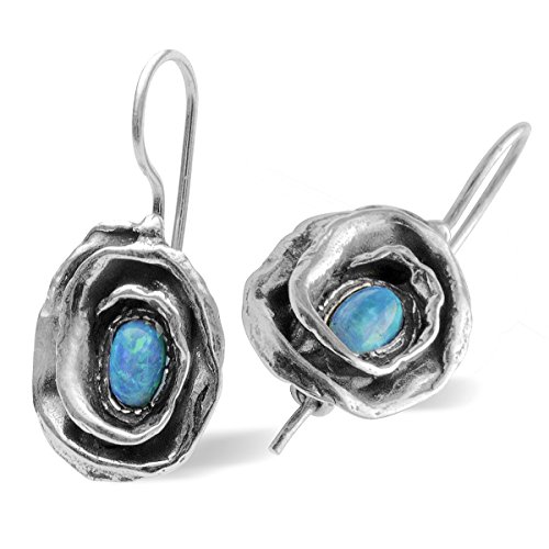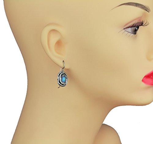 Vintage Look 925 Sterling Silver Rose Shape earrings with blue fire Opals and spiral design. 925 Sterling Silver blue fire Opal drop earrings. A 4 by 6 mm oval cabochon created blue fire Opal is inlaid in each of these textured and oxidized oval shaped Silver earring. The free form spiral design gives these earrings a very unique look with a feel of flow and movement. Unique Artisan Design.