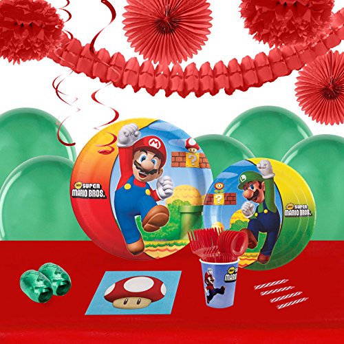 -. Feature : Super Mario Brothers 16 Guest Tableware & Deco Kit includes 16 dinner plates, dessert plates, cups, forks, spoons, 20 lunch nakpins, 2 solid table clothes, 12 latex balloons, 2 curling ribbons, 1 decoration kit, 1 box of 24 candles. / Add additional party tableware, decorations, favors, games, and activities to complete your celebration and entertain your guests. / Great for childrens birthday parties, kids school parties, a pizza party, or a theme party. / Features favorite characters such as Mario Luigi Peach Bowser and Toadstool