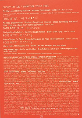 -. Feature : All About Shadow Quad (0.08 oz.) / Cream Shaper for Eyes in Chocolate Lustre (0.03 oz.) / Chubby Lash Fattening Mascara in Jumbo Jet (0.3 oz.) / Clinique Pop Lip Color + P.R.Imer in Cherry Pop (0.08 oz.)