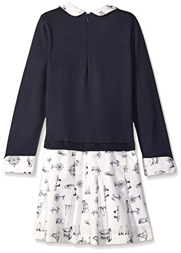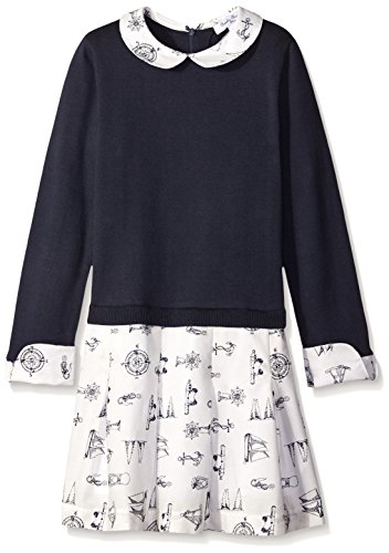 Novelty nautical printed mixed media dress - sweater sleeves and body with a woven collar, cuff and pleated skirt.