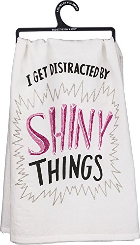 - Dish towel says: "I get distracted by shiny things" with pink glitter accents