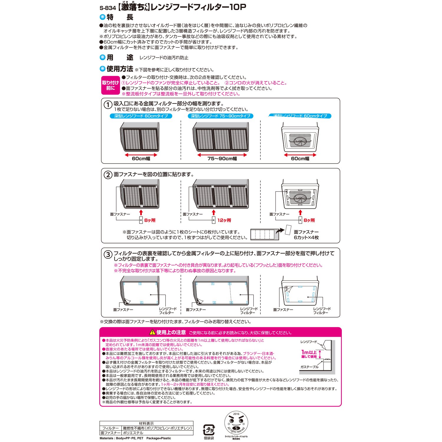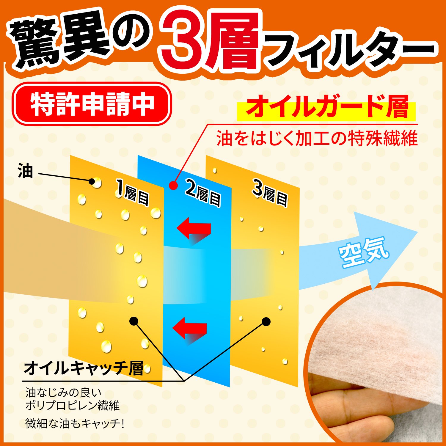 ● Three-layer structure filter in which an oil guard layer (oil repelling layer) that does not allow oil particles to pass through is used as an intermediate layer, and an oil catching layer of oil-friendly polypropylene fiber is disposed on upper and lower layers, soiling of the inside of the range hood