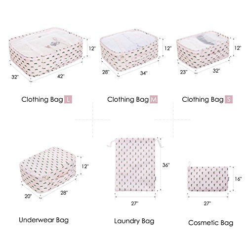 ONE-STOP Packing Organizers Solution -- 6 pcs Travel Packing Organizers includes: 1pc Large Clothing bag (43*32*12cm ) & 1pc Medium Clothing bag (32*28*12cm) & 1pc Small Clothing bag (32*23*12cm)& 1pc Underwear bag (28*20*12cm) & 1pc Laundry Bag (36*27cm) & 1pc Cosmetic Bag (27*16cm)