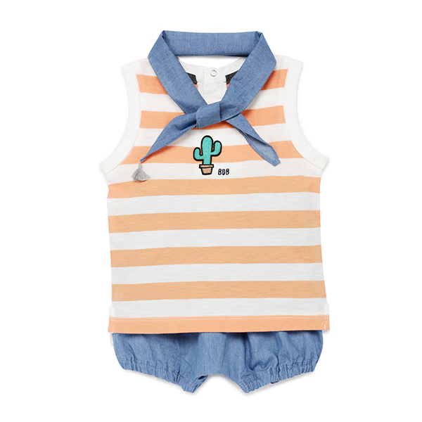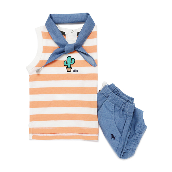 _클린한 STRIPE에 귀여운 선인장와펜이 포인트로 들어간 세련된 무드의 상하복입니다.