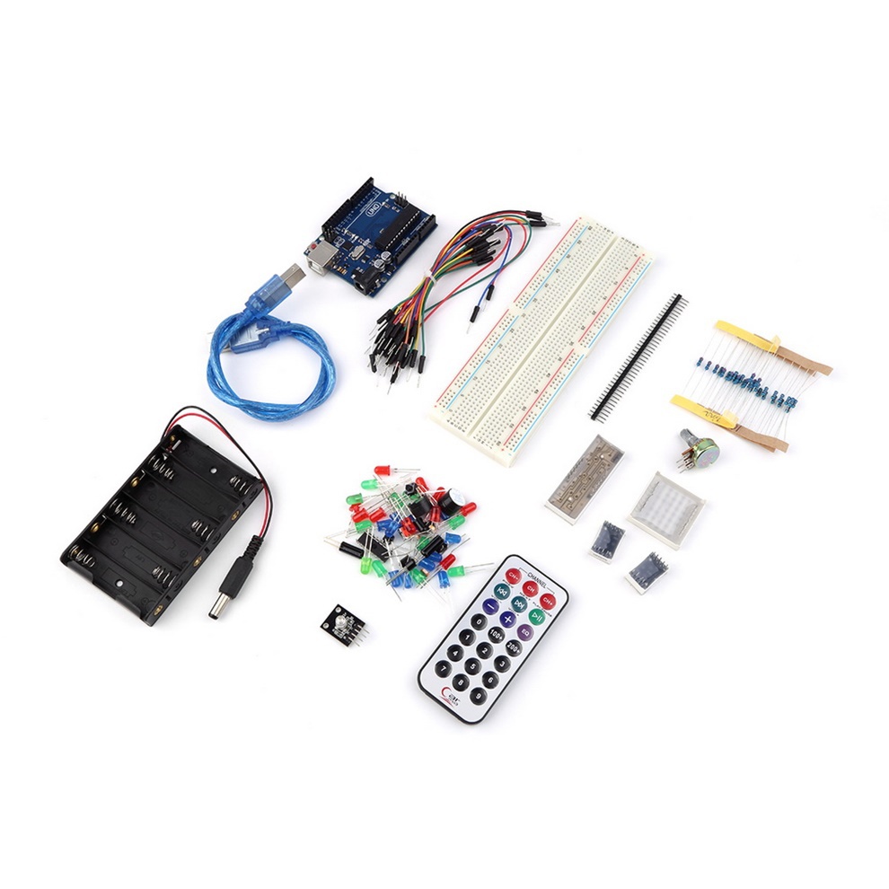 | Features: 100% Brand New and High Quality. This Set kit For Arduino walks you through the basics of using the For Arduino in a hands-on way. You'll learn through building several creative projects. The kit includes a selection of the most common. Starting the basics and Starter of electronics to more complex projects the kit will help you control the physical world with sensor and actuators. Specifications: Case Color: Clear Case Size: 23*16*6cm Net weight: 474.5g Package Includes: 1 * R3 UNO 1 * Pin 1 * MB-102 1 * Four digital tube 1 * A digital tube 1 * Active buzzer 1 * Passive buzzer 4 * 6*6mm key switch 1 * 6 battery box 1 * 10K potentiometer 1 * Three color lamp module 1 * 32 bread board line 1 * USB line 1 * Remote controller 1 * LM35 temperature sensor 2 * Vibration switch 1 * Flame sensor 1 * Infrared receiving head 3 * Photosensitive resistance 5 * Red LED 5 * Green LED 5 * Blue LED 1 * 8*8 dot matrix 1 * 74HC595 10 * Resistance 330 euro 10 * Resistance 1K 1 * Resistance 10K 1 * Case Box |