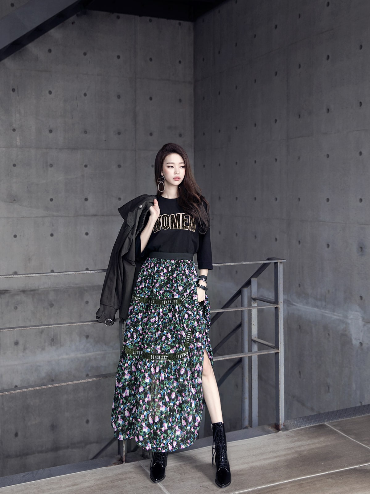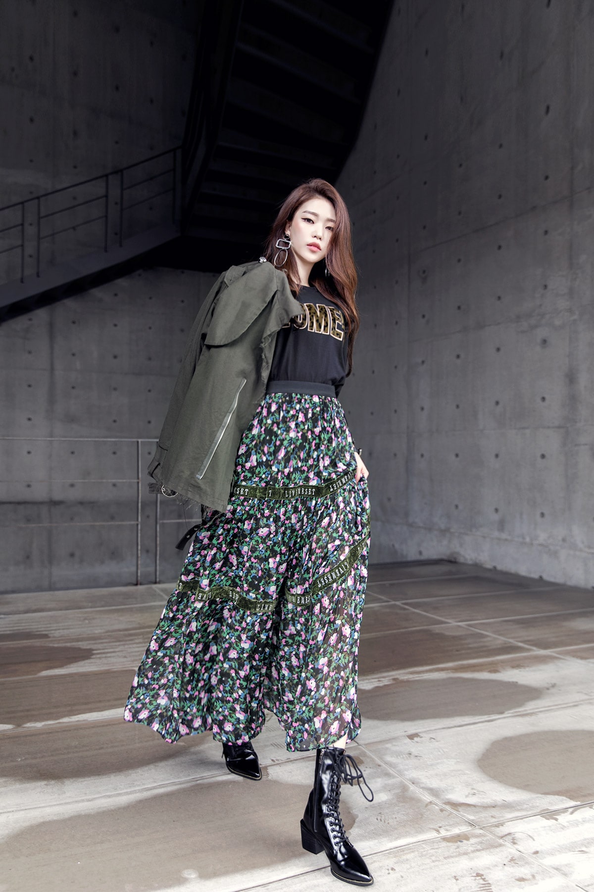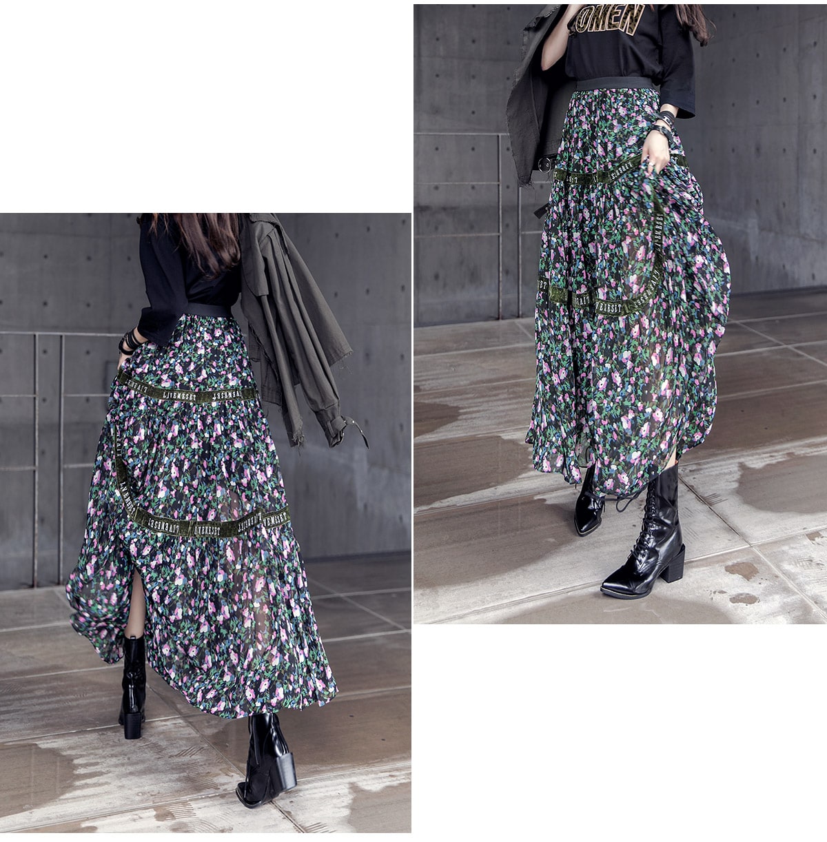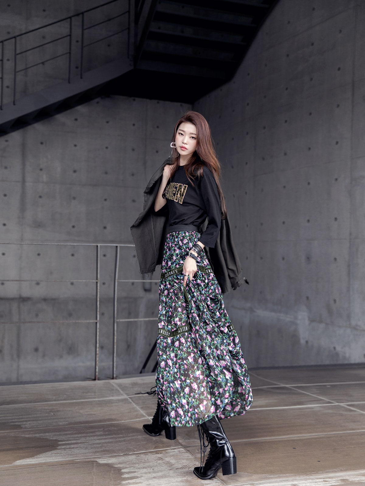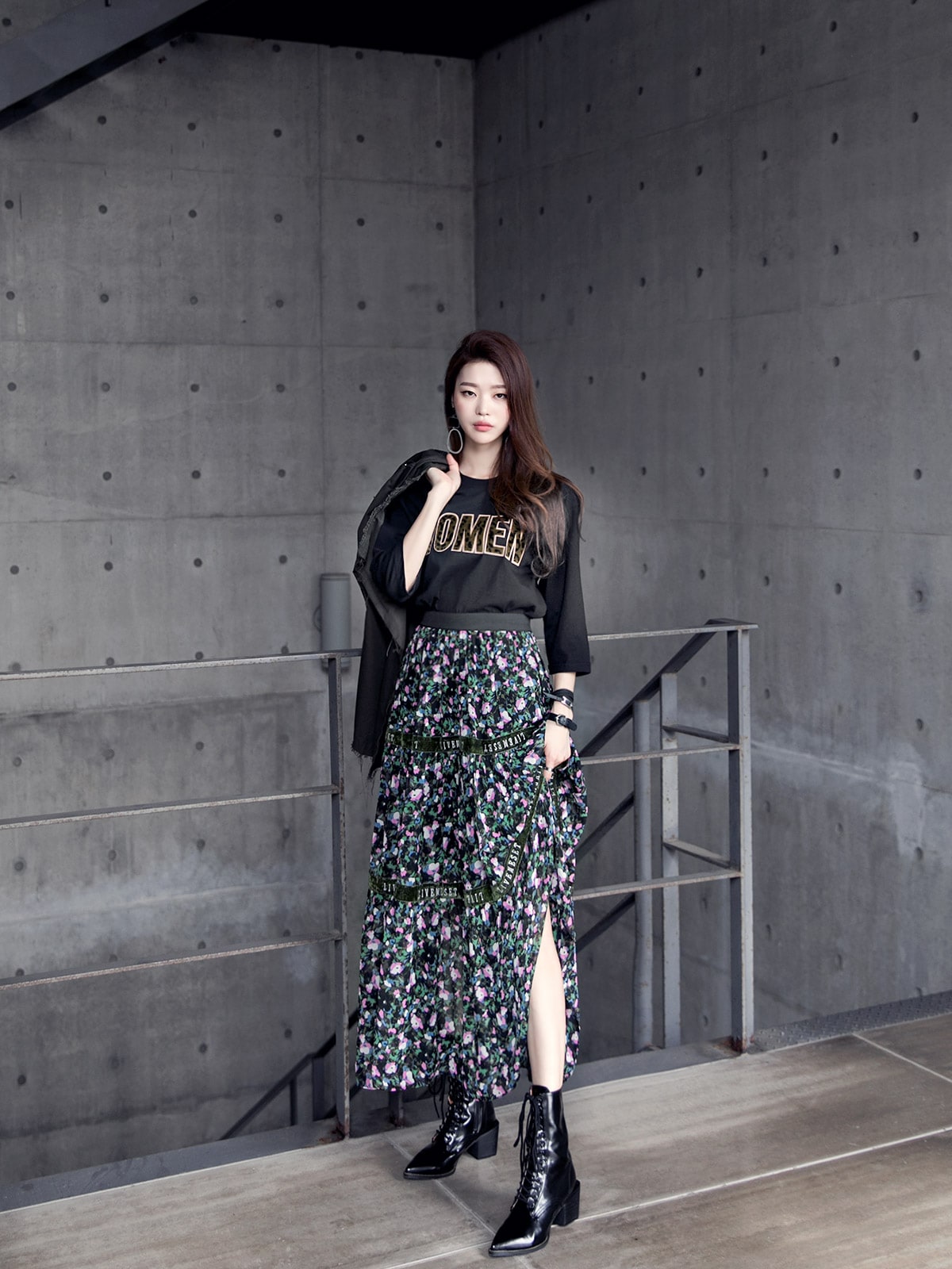 SK1773 플라워링 맥시 레이스 스커트 Black mix