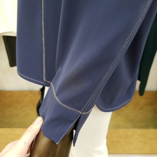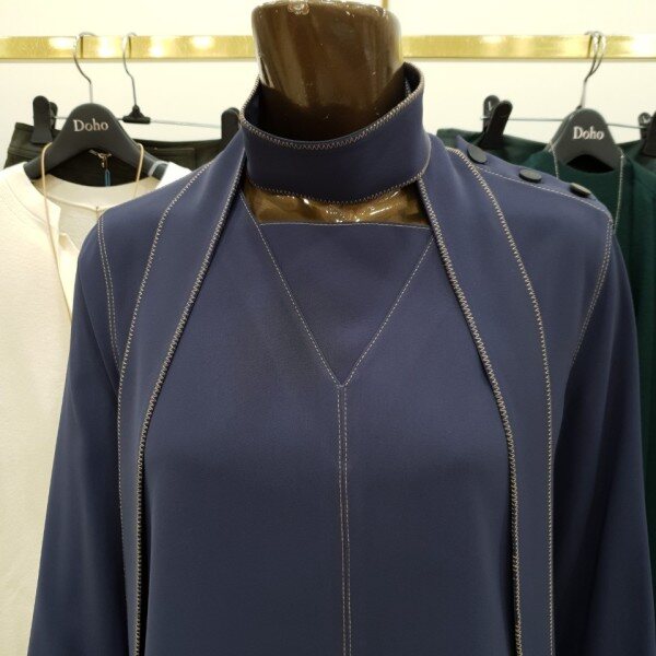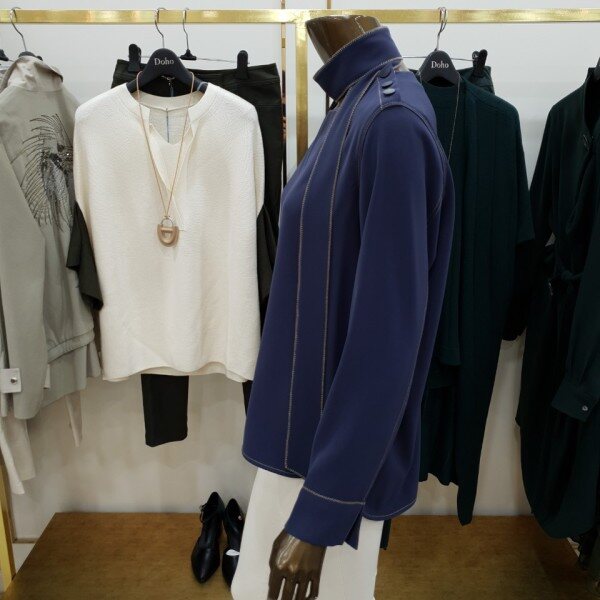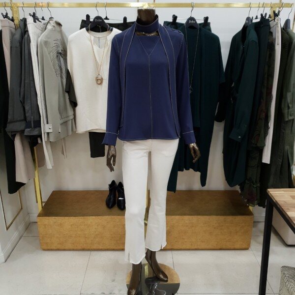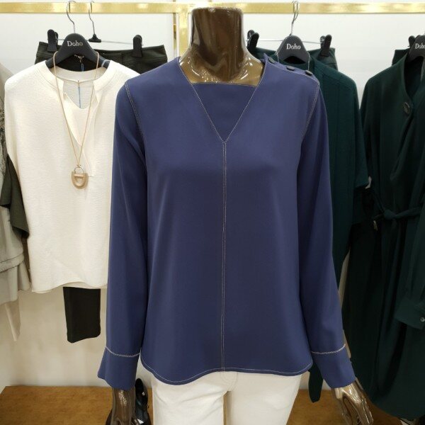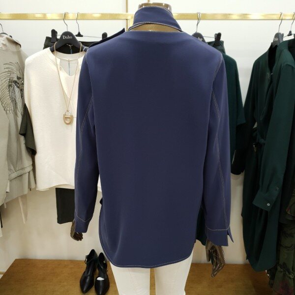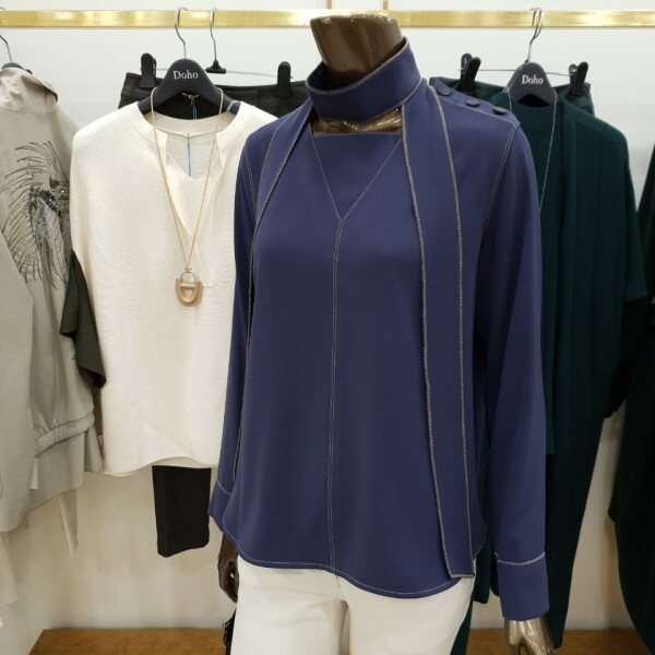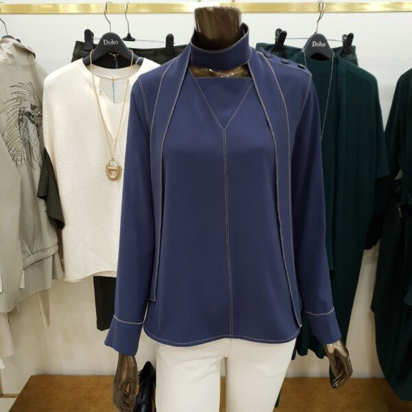 쉬폰 소재에 어깨의 단추 장식이 포인트인 블라우스로 스카프는 탈부착이 가능합니다