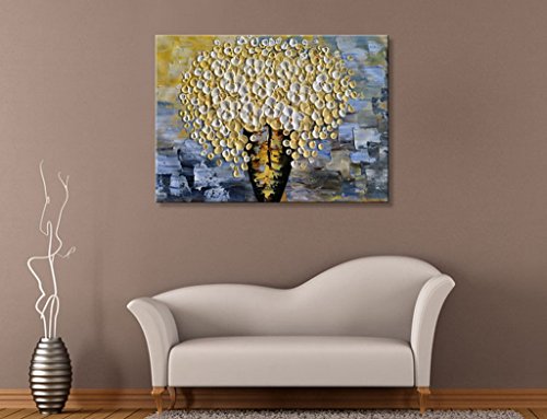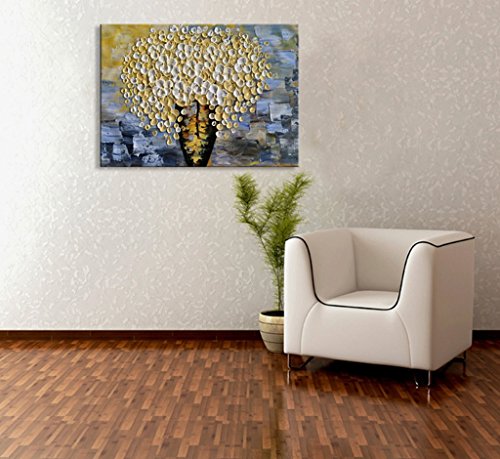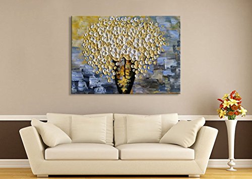 -. Title : Everfun Art Hand Painted Modern Textured Flower Oil Painting White Yellow Flower Canvas Wall Art Abstract Pictures Contemporary Artwork Floral Decor Stretched and Framed Ready to Hang